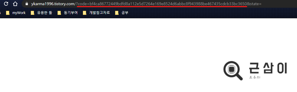 와 같은 형태로 인증코드를 파라미터로 하여 호출되기 때문에 보통은 개발하는 서버에 관련 로직을 넣고, 리스닝 주소를 따로 뽑아서 작성하는 것이 맞다. 하지만 역시 지금은 테스트 환경이기 떄문에, 간단히 동작하는 아무 주소나 앱 등록시 작성하고 호출시에도 해당 주소로 리다이렉트 하도록 하였다. 나는 나의 블로그 주소를 사용하였다. (http://ykarma1996.tistory.com)