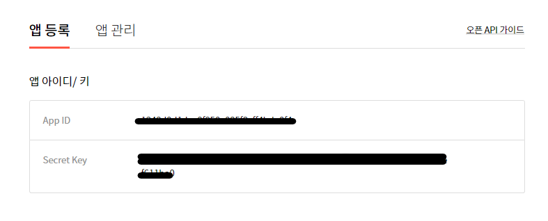 앱 등록이 완료되면, App ID 와 Secret Key 를 발급해주는데, 이후 Open Api 활용시 사용되는 값이니 잘 기억해 두도록 한다. (이후 앱 관리 화면에서 다시 확인할 수 있다.)