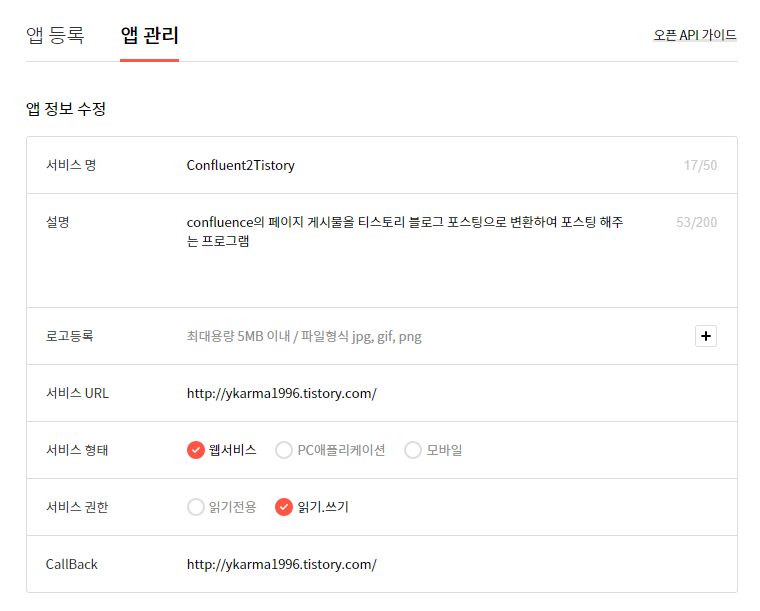 앱 등록시 입력하는 CallBack 항목에는 이후 서비스될 어플리케이션의 인증 API서버 주소를 써주어, 인증 후에 토큰값을 리다이렉트 하여 받을 수 있도록 한다. 아직 개발을 진행하는 단계라서 주소가 없는 경우에는 임의의 동작하는 주소를 작성하여도 추후에 앱 관리에서 수정할 수 있으니 걱정하지 않고 발급하여도 된다.