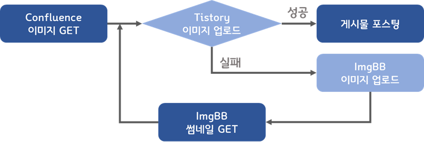 모든 이미지를 썸네일 이미지만 사용하면, 해상도가 만족스럽지 않은 경우가 생기기 때문에 우선은 tistory에 먼저 업로드 해보고, 업로드 결과가 문제 없으면 통과! 아니면 imgbb를 활용해서 썸네일 이미지를 받아와서 다시 tistory 업로드 로직을 태우는 것이 대략적인 시나리오 였다.