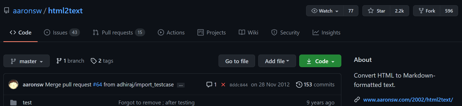 서비스화를 염두에 두고 여러가지 기능들을 추가하다 보니, Confluence로부터 리턴받은 html을 기준으로 티스토리에 포스팅 기능만을 지원할 것이 아니라, 마크다운 파일이나 PDF로도 다운로드 받을 수 있도록 하면 좋겠다는 생각이 들었다. 직접 로직을 구현하면 더 좋았겠지만, 찾아보니 이미 너무 잘 만든 모듈이 있길래 후다닥 다운로드 받아 사용해 보았다. 모듈의 이름은 html2text 였다.