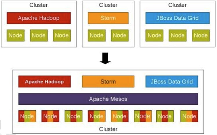 DC/OS를 지칭할 때 종종 marathon + mesos 라는 수식어를 붙이곤 한다. 실제로 DC/OS는 Apache 재단에서 핫한 프로젝트 중 하나였던 Mesos 라는 프로젝트에 핵심 기능을 의존하여 개발된 서비스인데, mesos는 컨테이너 오케스트레이션이라는 컨셉에만 초점을 두고 탄생한 플랫폼이 아니다. Mesos는 분산형 시스템 커널이라는 아이디어를 기반으로, CPU/MEMORY/STORAGE 등과 같은 여러 머신으로부터 분산된 컴퓨팅 자원들을 marathon 뿐만 아니라 하둡, 스파크, 카프카와 같은 다양한 프레임워크들에게 추상화하여 제공하고, 각 프레임워크들이 실행을 요청한 작업이 적절한 노드에서 실행되도록 한다.