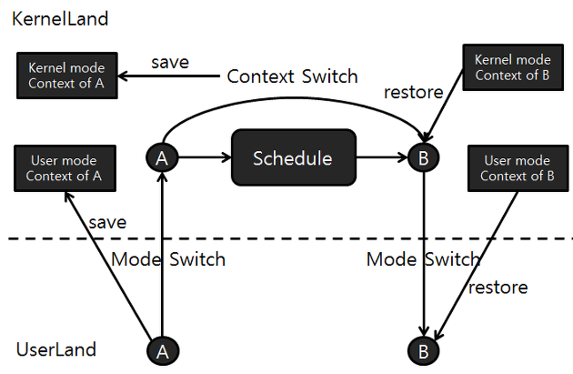 - A 의 커널컨텍스트가 메모리에 저장되고 프로세스 B 의 저장된 커널컨텍스트를 레지스터에 복원