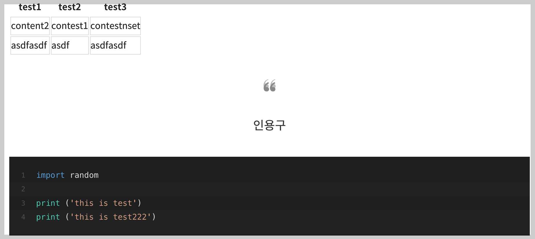 가볍게 테스트용으로 몇가지 아래 작성하고 프라치노 공간을 사용하는 다른 마크다운 러버를 위해 내가 몇가지 추가한 css 파일도 첨부한다. (css 잘 몰라서 그냥 대충 원하는거만 적용되게 덕지덕지 수정해 봤다.)