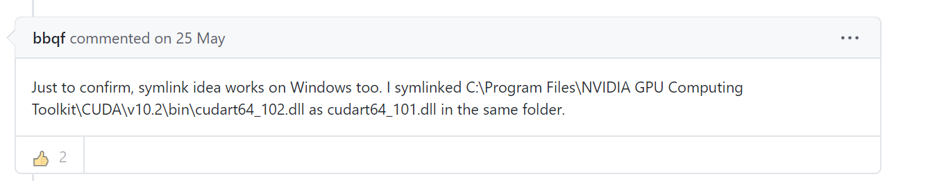 절망적인 가운데, tensorflow 공식 Git에 CUDA10.2 지원과 관련한 이슈에 비공식적인 방법이지만 해결방법이 거론되고 있는 것을 확인했다. 이슈내용 링크