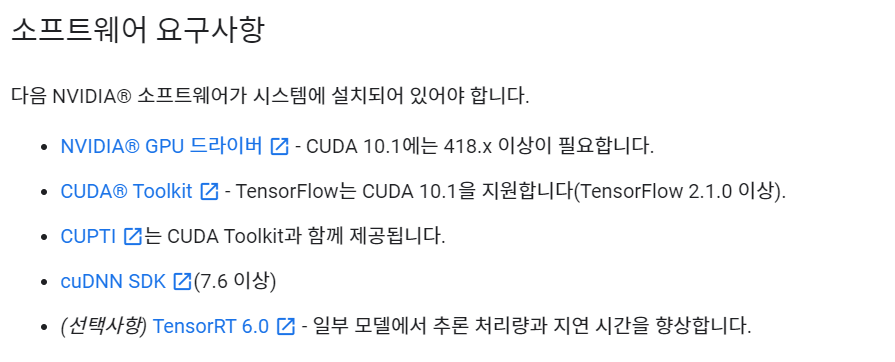 하지만, 그에 따라 tensorflow를 정상적으로 설치하고 사용하기 위해서 역시 GPU 인식을 위한 사전 요구사항을 충족해야만 하는 상황이 되었다.